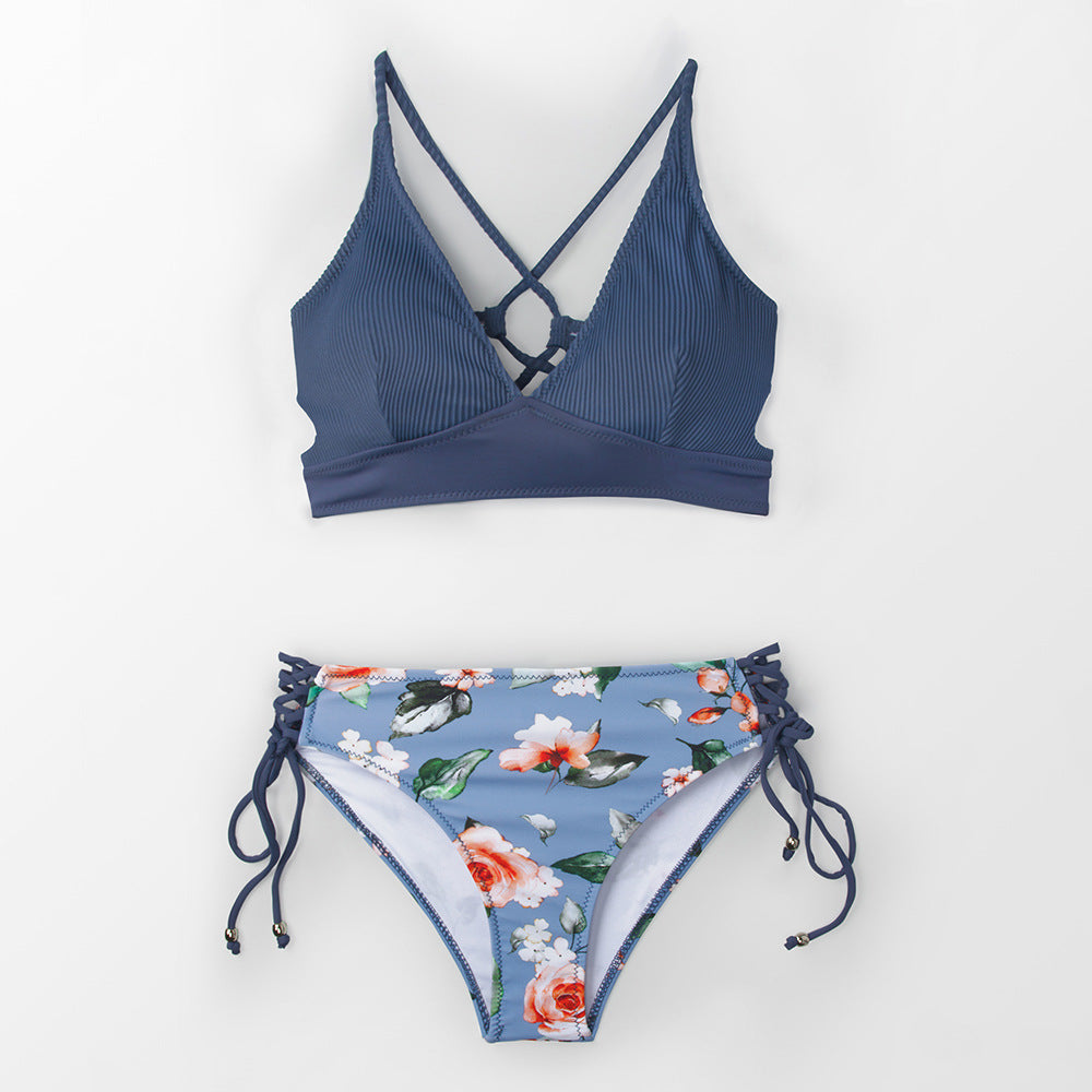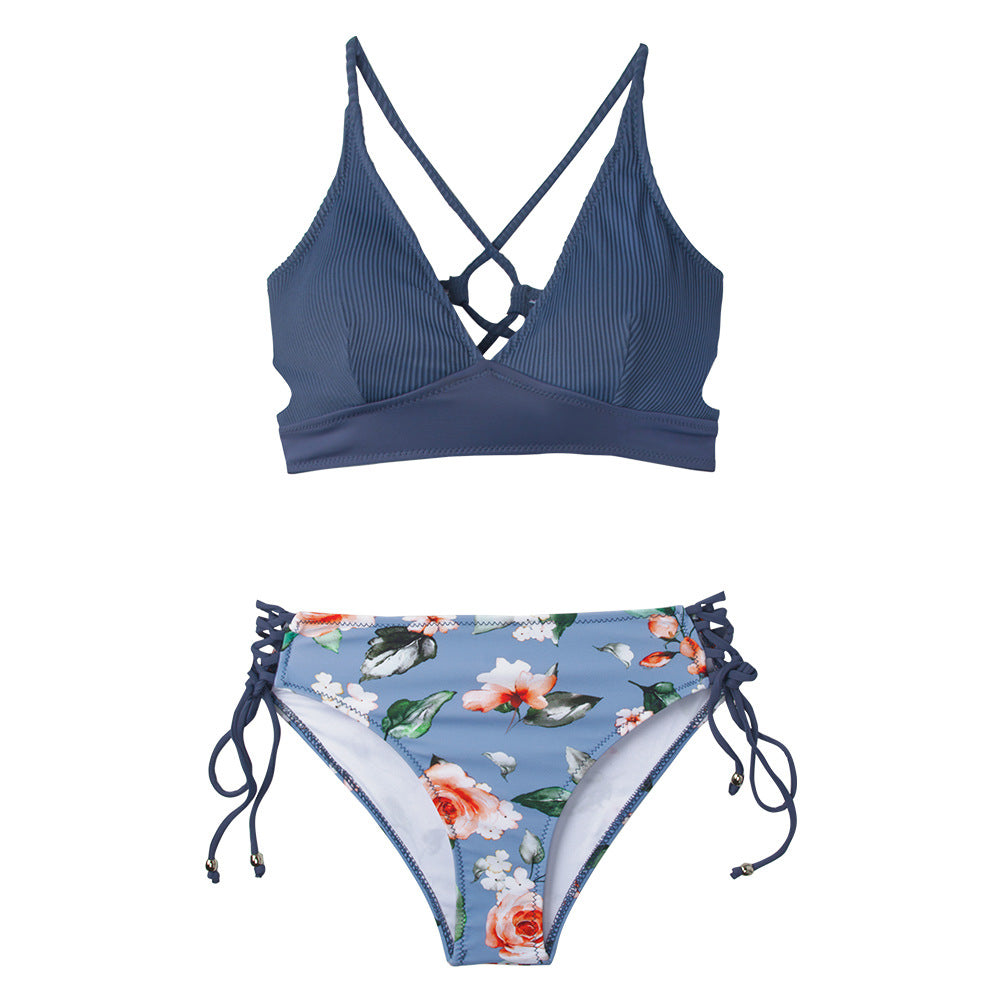 Printed Gray-Blue Lace-Up Halter Swimsuit